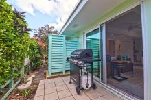 Description: Beach Villa 504 is located on the highest elevation of the Beach Villas community and boasts some very distinctive and attractive features. Its two patios have well crafted, comfortable, built-in benches around the perimeters and its kitchen has been completely remodeled with a side breakfast table which, with its extra leaves, doubles as a large dining table when family or guests are in town. The owners wisely maximized the space by creating a proper desk nook and separating the master bedroom with French doors so that the master bed occupies a separate space from a sitting area which can double as a guest bedroom. Essentially this two bedroom villa can become a three bedroom when friends or family are visiting. Its landscaping is lush and green with a thick privacy hedge and together with its large patio umbrellas those who prefer shade can enjoy outdoor living all day long! Villa comes fully furnished (including artwork) and also has a full size stackable washer and dryer. Another bonus is the outdoor shower with privacy screen.