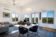 Description: This brand new 1,000 sq ft waterfront residence in Leisure Lee, Abaco blends modern coastal contemporary design with durable island construction. Elevated on cement piers and finished with Hardi board siding, impact glass windows, custom doors, and a platinum metal roof, the home offers both style and resilience. Inside, light-filled living spaces feature LVT flooring, statement lighting, and tasteful coastal décor. The glossy white kitchen is appointed with quartz countertops, stainless steel appliances, and floating shelves, creating a sleek and functional entertaining space. The beautifully tiled bathroom showcase refined finishes. Expansive IPE decking overlooks a peaceful canal where turtles glide through the clear waters. The seawall accommodates vessels up to 65 feet, with canal depths exceeding 6 feet at low tide, providing protected dockage and quick access to the Sea of Abaco. Offered fully furnished, with access to Leisure Leeâs pristine sandy beaches just a short walk away.